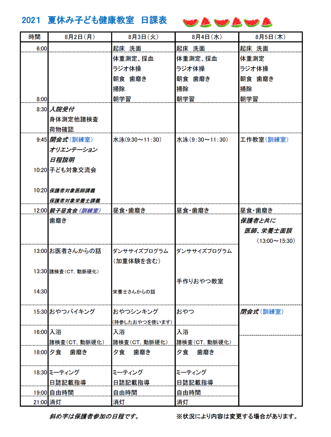 2021年夏休み健康教室:体験入院 《子ども健康教室》ご案内 このお知らせの内容は終了しました。 太りすぎはメタボリック症候群や糖尿病などの様々な生活習慣病の原因になることがあります。 この夏休みに当院小児科では、肥満のお子さんを対象に食事療法や運動療法などを学ぶ体験教育入院「子ども健康教室」を計画しています。新型コロナウイルスで生活様式が変化した今、感染対策の仕方も学びながら、ご家族で生活習慣を見直すきっかけにしてみてはいかがですか? 【対象】 小学生・中学生 *8名まで *参加申込み人数が少ない場合は実施を中止することがあります。 *集団生活可能な方の参加が原則です。 【日 程】 令和3年8月2日(月)8:30集合~5日(木)17:00終了予定 【主な内容】 * 食事指導(個別栄養指導・親子昼食会・食事やおやつの選び方指導) * 運動指導(水泳指導・ダンササイズ) * 医師・管理栄養士による講義(小児肥満について・食事・運動・生活など) * 検査(血液・尿・腹部CT・動脈硬化検査) * レクリエーション(イベント・おやつ作りなど) 【日課表】 【費 用】 *入院医療費(食事代含む)約6万円、その他スポーツ安全保険料800円、親子昼食会時の保護者費用一人500円が必要です。 なお千葉県内全市町村で入院費は中3まで子ども医療費の助成対象となっており、自己負担額は1日0~300円です。 【申し込み方法】 * 必ず電話にてお申し込み下さい。 (★)結果につきましては、定員を超える申し込みがあった場合は、初回参加の方、及び肥満度の高い方を優先させていただくため、7月13日までに電話にてご返事させて頂きます。受診後に当院入院受付で入院申し込みが可能となります。 ★お問合せ:小児科(内線303)平日10時~15時 【その他】 *初日に、申込み時にお渡しした食事記録や入院中の目標等書類の回収と、スポーツ安全保険料の徴収をさせて頂きます。 *保護者の方は初日午前中までと、最終日午後の日程に参加をお願いします。 ※状況により内容の変更、または中止となる場合があります。あらかじめご了承ください。 国立病院機構 下志津病院 千葉県四街道市鹿渡934-5 TEL 043-422-2511 (FAX 043-421-3007) ご案内のPDFはこちら 日課表のPDFはこちら